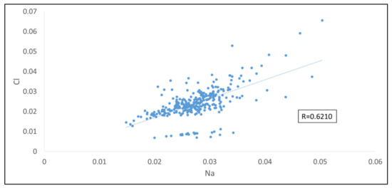 Selected ions were compared to identify the correlations between individual ions. Mainly, anions (F−, Cl−, NO2−, Br−, NO3−, PO43−, and SO42−), and cations (Li+, Na+, NH4+, Mg2+, Ca2+, and K+) were compared with Na+, Cl−, and K+, which were highly detected in the ion chromatography results. Out of all the compared ions, one of the top three ions that showed the highest correlation coefficient is shown in the result section. The correlation coefficient was calculated using the CORREL function in Microsoft Excel® (2013). For this study, the correlation coefficients were classified as follows: <0.29 (little if any correlation); 0.3–0.49 (low correlation); 0.5–0.69 (moderate correlation); >0.7 (high correlation) [21,22,23].