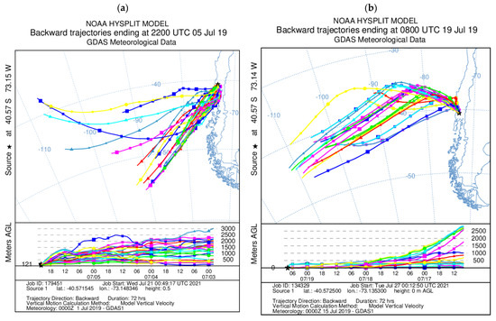 A backward trajectory analysis was conducted to simulate the air mass movement into Osorno. Figure 10a shows 5 July 2019 with a high PM2.5 concentration, and Figure 10b shows 19 July 2019 with a low PM2.5 concentration. The backward trajectory analyses conducted for both days with high and low PM2.5 concentrations showed a clear trend in the air mass movement into Osorno city from the South Pacific Ocean. These trajectory results suggest that marine aerosols may contribute to the PM2.5 in Osorno as a continuous input. A portion of the water-soluble ions in PM2.5 contain some marine-origin particulate matter; however, the total amount is somewhat limited. Thus, the marine-originated particulate matter is considered a limited base component of PM2.5 in Osorno city. Na+ is an ion also derived from biomass burning, so it is important to understand that the marine-derived Na+ is not the only source of Na+ detected from PM, since it is difficult to distinguish one from another. As mentioned above, Osorno city receives air mass from the South Pacific Ocean, and it is important to consider the effects of marine environment-derived Na+ or Cl−, as it may affect data interpretation.