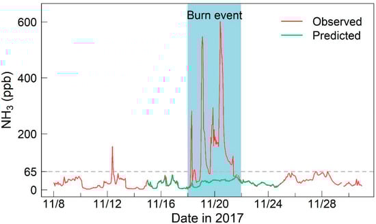 We first established a model (RF5) to predict the NH3 concentrations assuming that no burn event occurred from 18 to 21 November 2017. The predicted results are shown in Figure 2, with all predicted concentrations lower than 65 ppb. In addition, the temporal variation in predicted NH3 concentrations was basically similar to its observed value in the nonburning period. This finding indicates that the concentrations and temporal pattern of NH3 will not change significantly if there is no burn event.