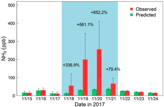 The difference between the predicted and observed concentrations of NH3 allows us to quantify the impacts of burn events on NH3 emissions. As shown in Figure 3 and Table S4, remarkable differences were not found between the observed and predicted concentrations of NH3 before the burn event, indicating that our model captured the variations in NH3 concentrations well. However, the observed concentration of NH3 increased drastically compared with the predicted value during the burning period, with increased ratios of 336.9%, 561.1%, and 652.2% in the first three days of the burn event. At the end of the burning period and with the resumption of “normal emissions”, the predicted values were consistent with the observations after 22 November. Overall, the observed and predicted concentrations of NH3 during the burning period were 145.6 ± 139.9 and 28.5 ± 10.4 ppb, respectively, resulting in an increase of 411%. These results indicated that the combustion source is an important factor of NH3 emissions.