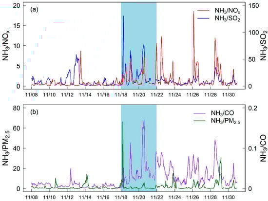 Temporal variation in the ratio of NH3 relative to NOX, SO2 (a), CO and PM2.5 (b).