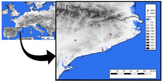 Geographic location of the area of study. (Left) European map with the region of interest marked with a black rectangle. (Right) Zoom of the region of interest showing the location of the elements of the LLS (red triangles) and of the XRAD (yellow triangles).