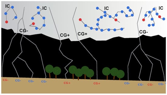 Scheme of the different types of lightning (IC: intra-cloud, CG+: positive cloud-to-ground, CG-: negative cloud-to-ground) in a thunderstorm and the sources (blue ones correspond to Level 1—multiple TL sources—and red ones to Level 2—single flash sources) detected for each one (based on []).