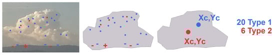 Idealised identification of different types of sources in a thunderstorm and its idealistic transformation into two centroids, which characterise the storm at a certain time.
