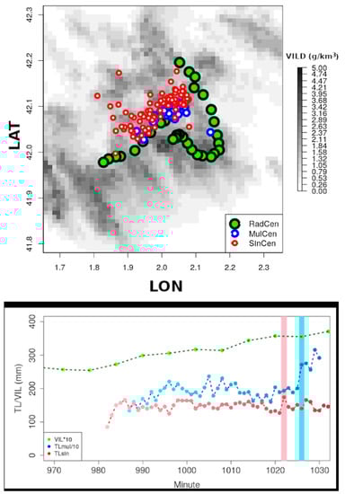 (Above) Partial tracking of the same thunderstorm presented in Figure 4, but considering the radar information (green points), the single-TL information (red dots), and the multiple-TL data (blue points). (Below) Partial life cycle of the same thunderstorm, showing the VIL evolution (6 min time resolution) and the TL with single- (red) and multiple- (blue) lightning sources. The vertical lines indicate the time of occurrence of the two LJs.