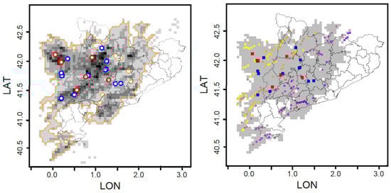 (Left) Total lightning area (shaded grey region) associated with multiple-lightning jump warnings (blue dots correspond to multiple-lightning sources and red ones to single sources). The orange line encloses the area associated with the warnings. Case of 10 October 2013. (Right) The same as the left panel (LJs marked with blue and red squares), but including the centroids of the thunderstorms identified based on the volumetric radar product (circle dots).