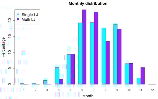 Monthly distributions (in percentage) of the SLJsts (cyan) and MLJsts (purple).