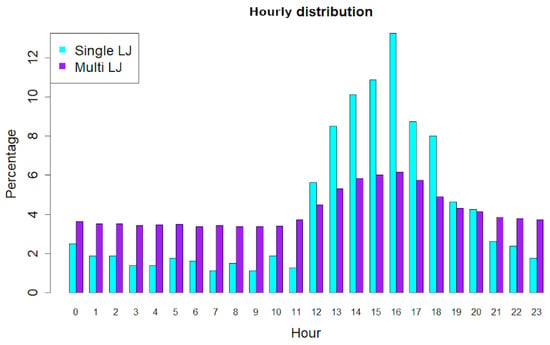 Hourly distributions (in percentage) of the SLJsts (cyan) and MLJsts (purple).