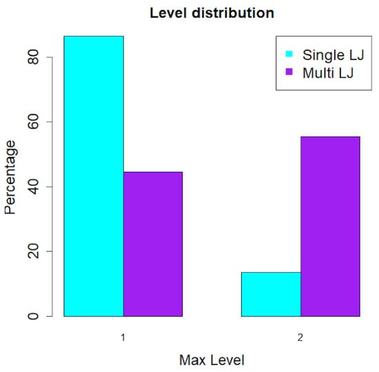 Considering the two levels of the LJs, the first associated with the detection of multiple sources of flashes (occurring in thunderstorms producing small hail, moderate wind gusts, or intense rainfalls) and the second linked to the single sources of the lightning in severe thunderstorms (the ones producing tornadoes, large hail, or strong wind gusts), Figure 9 presents which is the highest level of an LJ in SLJsts and MLJsts, respectively. In the case of MLJsts, a value of two does not mean that jumps of this level only have occurred. MLJsts usually produce both levels of LJs. In any case, SLJsts are more prone to give Level 1 jumps, while the contrary occurs in MLJsts. In this way, deeper convective thunderstorms will produce more than one LJ and at least one of Level 2 also.
