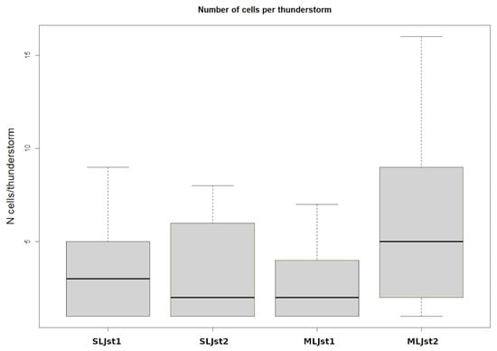 The analysis of the radar data in cases of thunderstorms producing LJs was performed using the information of the algorithm of identification, characterisation, tracking, and nowcasting of convective cells of the Meteorological Service of Catalonia []. This consisted of determining the behaviour of some signatures such as the number of convective cells and the reflectivity and the height of those cells. The thunderstorms were classified as: (1) with a single Level 1 jump (SLJst1), (2) with a single Level 2 jump (SLJst2), (3) with multiple jumps all of Level 1 (none of Level 2) (MLJst1), and (4) with multiple jumps and at least one of Level 2 (MLJst2). Figure 10 reveals how the MLJst2 category of thunderstorms presented the largest number of cells on average (with a mean value of five), probably because of the high degree of organisation of the convection and the largest duration. On the other hand, thunderstorms with MLJst1 had the lowest number of cells, with a mean value of two, a bit lower that the class of thunderstorms with SLJst2.
