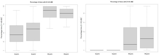 In a similar way, but for the maximum reflectivity of the full cell volumes (Figure 12), the SLJsts usually had a shorter duration of exceedance of 45 dBZ than MLJst. Besides, SLJsts rarely exceeded during their life cycle 55 dBZ, contrary to MLJst. Finally, it is important to remark that this exceedance was more common in MLJst2.