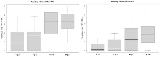 Finally, the echo top 35 dBZ (Figure 13) presented again a similar behaviour as the reflectivities, for both thresholds of height exceedance (6 km and 8 km). SLJsts exceeded for a shorter time period both thresholds, in comparison to MLJsts. Besides, the values were larger in those MLJst2 cases.