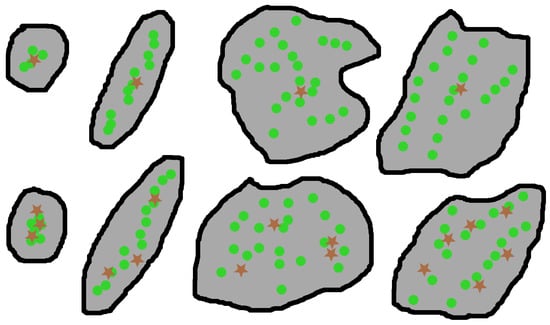 Scheme of the classification of the LJ-producing thunderstorms according to the number of jumps (brown stars): SLJsts (above) or MLJsts (below). The shadowed grey area indicates the limits of the thunderstorm based on the reflectivity footprint, while the green dots correspond to the cells identified using the algorithm of []. From left to right: isolated (a unique convective cell with a reduced path), lineal (a unique convective cell with a large trajectory), unorganised (multiple convective cells following unconnected paths), and organised (multiple cells with parallel or quasi-parallel trajectories, or the result of the splitting and merging processes).