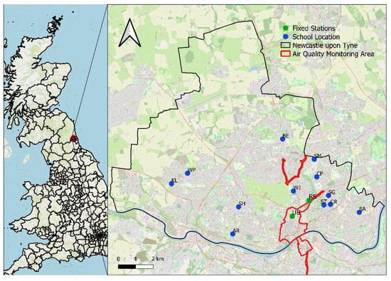 There are 92 government-funded schools and 9 independent schools in Newcastle [28]. In total, 22 schools in Newcastle have static air quality monitors (AQMs): 21 government-funded schools and 1 independent nursery. These AQMs have been provided to the schools through a partnership between NCC and the Newcastle Urban Observatory (UO) as part of a project called ‘The Healthy Schools Project’ [29]. The aim of the air quality work within this project is to raise awareness and engage schools, parents, and children in monitoring school ambient air quality [29].