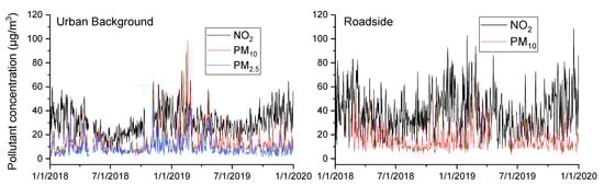 When comparing pollutant concentrations at the two sites, these data indicate that in both 2018 and 2019, NO2 and PM10 concentrations were higher at the roadside site than at the urban background site. When comparing pollutant concentrations by year, these data suggest that concentrations of PM10 increased between 2018 and 2019 at both the urban background site and the roadside site. Daily average NO2, PM10, and PM2.5 concentrations at the urban background and roadside sites from 1 January 2018–31 December 2019 are shown in Figure 2.