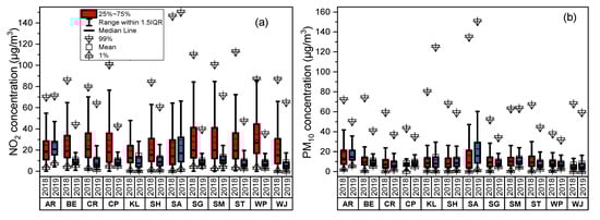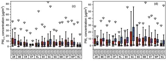 Boxplot of the annual mean concentrations of (a) NO2, (b) PM10, (c) PM2.5, and (d) PM1 at individual schools based on the available data during 2018–2019.