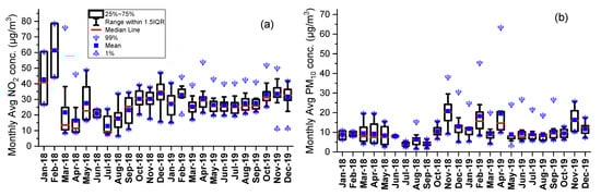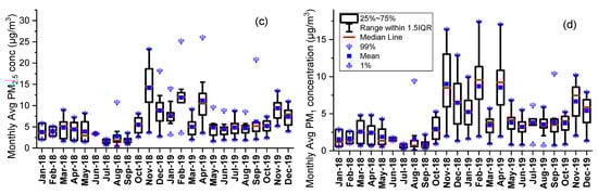 Boxplot of the monthly average concentrations of (a) NO2, (b) PM10, (c) PM2.5, and (d) PM1, for all schools combined, from January 2018 to December 2019.