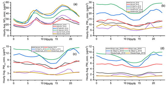 PM10 levels outside of the 3 chosen schools show an almost opposite shape to NO2 concentrations over 24 h (Figure 5b). Rather than two distinct peaks, PM10 concentrations show a “U-shape” and are at their highest from midnight until early morning and their lowest in the middle of the day. This indicates that, when compared to NO2 concentrations, PM10 concentrations are less associated with traffic volumes. Both the 2018 and 2019 maximum hourly PM10 concentrations occurred at St Alban’s RC Primary and were 23.8 and 29.3 μg/m3, respectively. These peak PM10 concentrations were higher than the peak PM10 concentrations at both the urban background and roadside monitoring sites in 2018 and 2019.