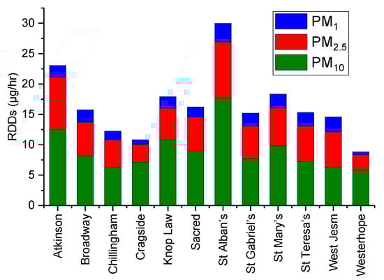 During the study period, the highest total PM10 RDDs (µg/h) occurred outside Atkinson Road Primary (12.5 µg/h), Knop Law Primary (10.8 µg/h), and St Alban’s RC Primary (17.7 µg/h). The lowest total PM10 RDDs occurred outside Chillingham Road Primary (6.3 µg/h), West Jesmond Primary (6.3 µg/h), and Westerhope Primary (5.8 µg/h). The highest total PM2.5 RDDs occurred outside Atkinson Road Primary (8.7 µg/h), St Alban’s RC Primary (9.2 µg/h), and St Mary’s Catholic (6.2 µg/h). The lowest occurred outside Cragside Primary (2.9 µg/h) and Westerhope Primary (2.5 µg/h). The highest total PM1 RDDs occurred at West Jesmond Primary (2.5 µg/h) and St Alban’s RC Primary School (3.0 µg/h). The estimated RDDs of each pollutant at each of the 12 schools can be seen in Figure 6. The estimated RDD is an indicator of the health risk posed by ambient PM concentrations for the children attending those schools [9].