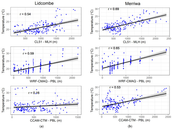 Scattered plots of temperature versus CL51 MLH as measured at (a) Lidcombe and (b) Merriwa and predicted PBLH from WRF-CMAQ and CCAM-CTM from 12 to 19 February 2021. The regression lines with 95% confidence band are in black colours.