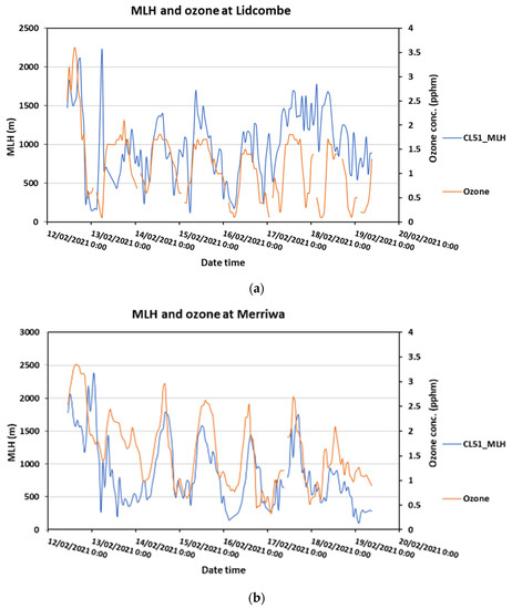 In a study of the impact of mixing layer height on air quality in winter in Delhi, India, Murphy et al. 2020 [31] analysed CL51 ceilometer MLH data and ground monitoring data. They found the ozone was strongly correlated with MLH, but PM2.5 had less correlation with MLH. Our results, however, are more consistent with Geiß et al. 2017 [32] in their study on the relations between MLH from CL51 and ambient pollutant concentration measured on a ground station in Berlin. Their results showed that the correlations between MLH and concentrations of pollutants (PM10, O3 and NOx) for different locations in Berlin were varied. There was no clear pattern in correlation with PM10, which was quite different for different sites, whereas the correlation with NOx seemed to depend on the vicinity of emission sources on main roads [32]. Only in the case of ozone, a clear positive correlation was found with R of 0.69 at Merriwa and 0.45 at Lidcombe, from 12 to 19 February 2021 (summer) and 0.73 at Lidcombe, and 17 April to 2 May 2021 (autumn). This is not surprising, as ozone is a secondary pollutant formed from photochemical processes driven by sunlight occurring over a regional scale, and hence it has a longer correlation distance than other pollutants [33].
