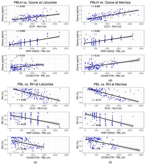 Time series of hourly ozone and MLH as measured at (a) Lidcombe and (b) Merriwa from 12 to 19 February 2021; scattered plots of measured ozone and RH versus PBLH as measured by CL51 ceilometer and predicted by WRF-CMAQ and CCAM-CTM at (c,e) Lidcombe and (d,f) Merriwa. The regression lines with 95% confidence band are in black colours.