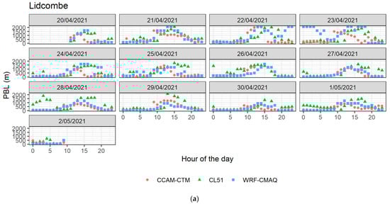 Another comparison analysis was also performed for an autumn period from 20 April 2021 to 3 May 2021. The time series of the predicted PBL profiles by the selected numerical models and the derived MLH from the ceilometers, during the period from 20 April 2021 to 2 May 2021, are shown in Figure 5. There is a reasonable agreement between the models and the observation. At Lidcombe, the peak of the MLH occurred at around midday from 12:00 to 15:00 h, as expected, usually at the height from 1500 to 2000 metres. Both CCAM-CTM and WRF-CMAQ slightly underpredicted the MLH peaks. The model predictions of the nocturnal PBL heights were lower than the observations highlighting the complex structure of this layer during this period. Shi et al. 2020 [4] also reported the nocturnal boundary layer heights were seriously underestimated by the WRF model in a study in Beijing from 26 to 31 December 2017.