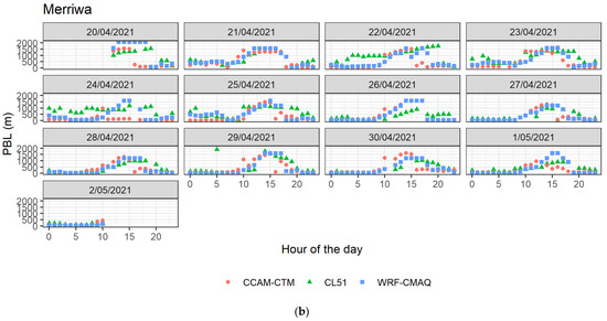 At Merriwa, when compared to ceilometer observations for the period between 20 April 2021 to 2 May 2021, both the air quality models CCAM-CTM and WRF-CMAQ predicted the PBLH reasonably well. Similar to the Lidcombe site, the nocturnal PBLH predictions were underpredicted. In particular, on the 23 and 24 April 2021, the estimated nocturnal MLH was high, at mostly above 500 m, indicating warmer air above ground. However, the prediction of CCAM-CTM PBLH was less than 100 m, while WRF-CMAQ nocturnal PBLHs varied between 50 m to 400 m on 23 April 2021, and were reasonably good compared to observation. Similarly, WRF-CMAQ nocturnal PBLHs on 24 April 2021 varied between 50 to 600 m. The underprediction of nocturnal PBLH in the two air quality models can also be due to MLH being assigned erroneously to the residual layer height, rather than the minimum height in the stable layer below it in the minimum gradient detection algorithm used in the CL51 ceilometer [32].