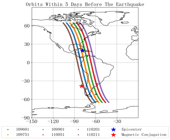 According to the empirical Formula R = 100.43N (N is the magnitude and R is the radius of the seismogenic zone) for strong earthquakes, it can be known [28] that the seismogenic zone of an earthquake of Mw7.7 on the Richter scale is about 2046 km (longitude span is about 18°). In order to reduce the signal interference of the solar activity during the day to the satellite observation, the waveform data of the night-side ascending orbit electric field is selected as the research object. Based on the observational data of the ULF frequency band of the space electric field, the ionospheric disturbances over the seismogenic zone in the southern seas of Cuba before the earthquake were analyzed. According to the epicenter location of the Caribbean earthquake (19.46° N, 78.79° W), the ascending orbit data when the satellite is above the seismogenic zone of southern Cuba in the 5 days (1.24–1.28) before the earthquake were selected, and its satellite projection point trajectory is shown in Figure 1. The following analysis is conducted based on the six pre-earthquake orbits and their revisited orbits.