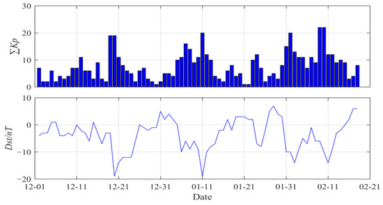 Geomagnetic activity index is closely related to ionospheric changes in space. In order to obtain and identify the anomalous information of ionospheric disturbances related to earthquakes, it is necessary to exclude disturbances caused by known geomagnetic activities. The ∑Kp and Dst indexes in the two months before the earthquake were collected and plotted, and the activity changes are shown in Figure 2. The Kp index refers to the index used by a single geomagnetic station to describe the intensity of the geomagnetic disturbance every 3 h a day, and the ∑Kp index represents the sum of 8 Kp indices per day. If ∑Kp > 30, it is considered that the geomagnetic activity of the day is strong; Dst is the change index describing the magnetic storm, and it is generally considered that the Dst index higher than −20 nT is a quiet period. Analysis of Figure 2 finds that the ∑Kp and Dst indexes are both within threshold values. It can be confirmed that the study period of this earthquake case is the geomagnetic quiet period [29].