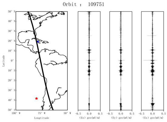 Orbit 109,601 and its revisited tracks (the red and blue five-pointed stars indicate the magnetic conjugate and epicenter positions, respectively, and the black frame indicates the seismogenic range where disturbance signals may exist, the horizontal blue dotted line is the threshold set according to the standard deviation of the electric field signal after reconstruction, respectively; the following figures same as here noted).