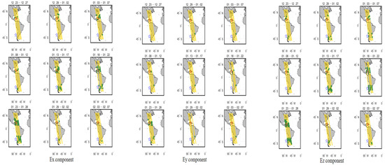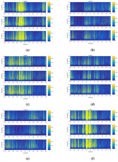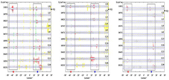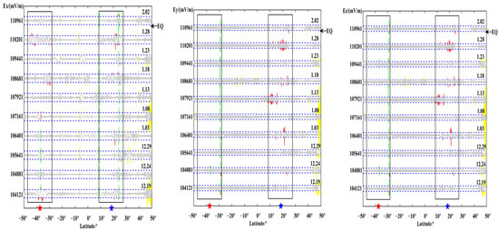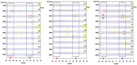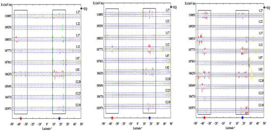 The above figures show the evolution of the three components of each orbit over time. Observing its changes, most of the pre-earthquake orbits showed a certain degree of disturbance changes in the vicinity of the seismogenic zone, which is consistent with the results obtained by the above S–G filtering combined with wavelet analysis. Observing the above figure comprehensively, the temporal and spatial changes of the electric field signal can be summarized as: within one month before the earthquake, the revisited orbit had obvious enhanced disturbances at the epicenter position, and some signal disturbances shifted to the equator. The signal appeared after the earthquake and gradually returned to the form of the calm period before the earthquake. At the same time, it is found that, compared with wavelet time-frequency analysis, EMD can more clearly amplify the changes near the epicenter and provide a more detailed description of the epicenter data.