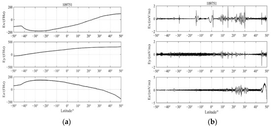It can be seen from Table 1 that among the decomposed signals of the three components of Ex, Ey and Ez, the IMF larger than the mean value of the sample entropy is IMF1–9. Because of the large amount of information it may carry, IMF1–9 is selected for signal reconstruction to obtain more significant signal changes. The original signal and the reconstructed signal are shown in Figure 5. Compared with the original signal, the reconstructed signal removes the electric field trend and extracts the change value of the electric field more clearly. The analysis shows that the Z component in 15° N~25° N has a large abnormal jump.