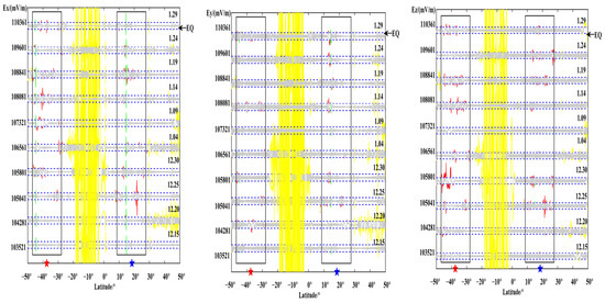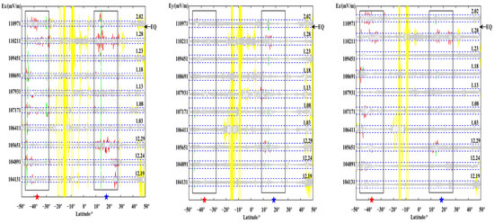 Due to the complexity and diversity of space environment, signals caused by other noise interference are ignored in this study, and only signals that may be related to earthquakes are marked in red. Analyzing the reconstructed signal of each orbit, it is found that multiple component data have pulsed interference in the form of a fixed period, and the distribution is relatively uniform. This is consistent with the characteristics of the calibration signal in the DEMETER satellite. Therefore, it is believed that this periodic disturbance change is due to the interference caused by the calibration signal, and is marked in green here; besides, there are more severe interference characteristics near the north and south poles, and some signal changes are also found near 10° south latitude. According to Section 2.3, there is no impact from space magnetic storm interference, so the influence of interference may therefore be caused by the signal change of the electric field sensor itself. After excluding signals at the epicenter and its conjugate vicinity, which can be confirmed to be irrelevant to the earthquake, the other interferences are uniformly marked as yellow, and only the epicenter and its conjugate area, that is, the change of the red signal, are focused.