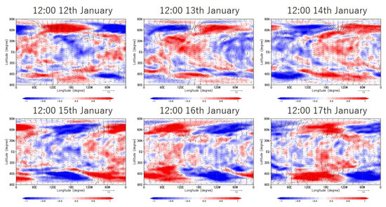 We extract wave structures by using composite methods, such as averaging each field with periods of 5 and 4 Earth days for the frf and control cases, respectively. Figure 4 shows the composite mean of horizontal wind sections (vector) and temperature (color) at 70 km for the (a) frf and (b) control cases. In the control case, zonal winds of ~2 m/s with a wavenumber 1 component symmetric around the equator prevail in the equatorial region, while meridional winds are small (Figure 4b). The Kelvin wave corresponds to this structure. The equatorial region similarly has a temperature of ~0.3 K with a wavenumber 1 component, although only horizontal winds are assimilated. The temperature phase differs by ~60° from the zonal wind phase, indicating that the wave propagates vertically [35].