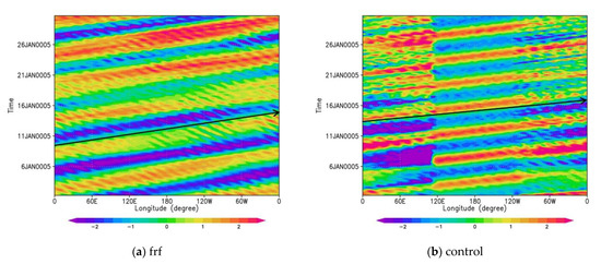 Longitude–time cross-sections of zonal wind (m/s) deviation from its time average from 1 January, 5th year at 70 km and the equator for the (a) frf and (b) control cases. Black arrows indicate periods of ~5 and ~4 Earth days for (a) and (b), respectively.