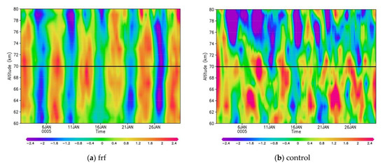 Time-altitude cross-sections of zonal wind (m/s) deviation from its zonal and time averages at 10° W and the equator from 1 January, 5th year for the (a) frf and (b) control cases. Black lines indicate 70 km altitude.