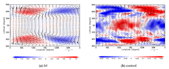 The Rossby wave, on the other hand, appears in the frf case. In particular, vortices with a wavenumber 1 are predominant in the mid-latitudes, with zonal and meridional winds of ~5 m/s (Figure 4a). In the mid-to high-latitudes, a temperature of ~1.2 K with a wavenumber 1 component is also predominant. This structure is similar to the Rossby wave associated with baroclinic instability, as reported in a previous study [29]. It is worth noting that there is essentially no temperature disturbance in the equatorial region.