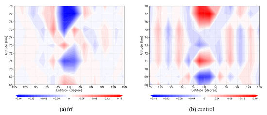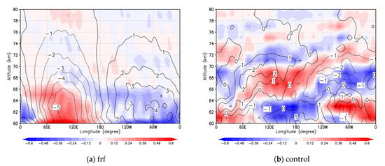 Latitude–altitude cross-sections of acceleration and deceleration (m/s day−1) estimated by the EP flux (color) for the (a) frf and (b) control cases. Time averages for 20 Earth days are conducted after the Kevin wave is reproduced.