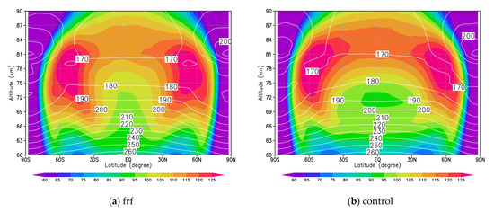 Latitude–altitude cross-sections of zonally averaged zonal wind (m/s; color) and temperature (K; contour) on 30 January, 5th year for the (a) frf and (b) control cases.