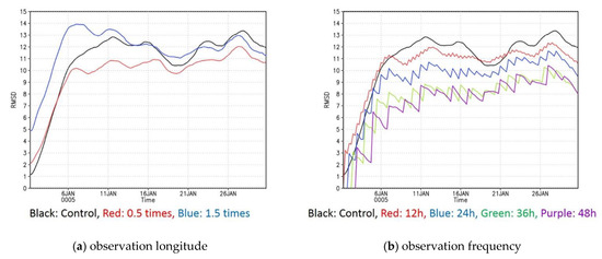 Root-mean-square deviations (RMSD) of zonal wind (m/s) calculated by Equation (4) at 70 km in each assimilated case from 1 January, 5th year. Dependency on the range of (a) observation longitude and (b) observation frequency. In (a), observation longitudes are half (red line) and 1.5 times (blue line) of the control case with 120° (black line). In (b), observation frequencies are 12-Earth-hourly (red line), 24-Earth-hourly (blue line), 36-Earth-hourly (green line), and 48-Earth-hourly (purple line) compared with the control case with a 6-Earth-hourly (black line).