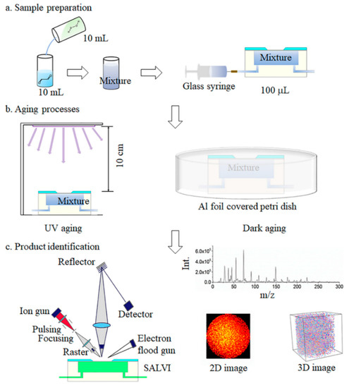 The experimental setup and workflow are illustrated in Figure 1. Before aging experiments, 5 mM of glyoxal and 20 mM of H2O2 solution were mixed thoroughly in a glass vessel (Figure 1a). A syringe pump (Cole-Parmer, Vernon Hills, IL, USA) was connected to inject the mixture solution into the device at a flow rate of 10 μL/min. The devices were covered with aluminum foil (Figure 1b) and kept away from light for a series of aging times to simulate dark aging. For UV aging, the reactant solution was first injected into the SALVI microreactor channel [42,43] and the microreactor was set 10 cm below a UV illumination source (Oriel lamp model 6035, power supply model 6060, Franklin, MA, USA) for different periods of time [45]. The lamp current was 18 ± 5 mA. With the 18 mA power supplies, 90% of the output wavelength is 253.7 nm with an output power of 70 W in AC mode. It is estimated to provide 10−13–10−12 M of OH radicals in the reactor [48]. We set the aging time from 0.5 to 8 h to simulate the average real solar illumination time in the atmosphere. All samples were prepared in the SALVI microreactors and the a–l surface was studied using in situ liquid SIMS. The sample matrices are listed in Table S1.