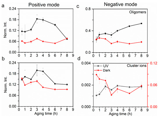 Comparison of relative yields of (a) oligomers and (b) cluster ions in the positive ion mode at the a–l interface between UV and dark aging. Similarly, comparison of relative yields of (c) oligomers and (d) cluster ions in the negative ion mode. The error bars represent the standard deviation of replicate measurements. Normalization was performed using selected products’ total ion counts.