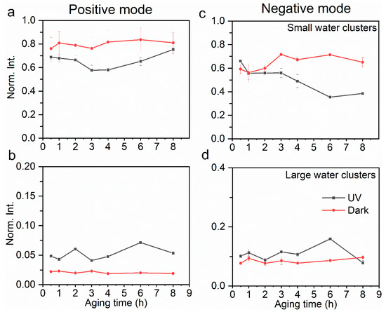 Comparison of relative yields of small water clusters (a) and large water clusters (b) in the positive ion mode at the a–l interface between UV and dark aging. Similarly, comparison of relative yields of small water clusters (c) and large water clusters (d) in the negative ion mode. The error bars represent the standard deviation of replicate measurements. Normalization was performed using selected products’ total ion counts.
