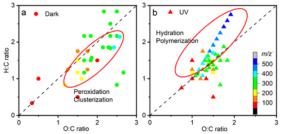 Two-dimensional van Krevelen plots of key products observed by in situ liquid ToF-SIMS in the negative ion mode of (a) dark aging and (b) UV aging.
