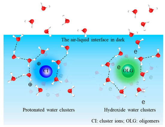 Recent laboratory studies investigate organic peroxide formation mechanisms in bulk in dark [30,31], and nucleophilic attack of the O atom was proposed [32]. Cluster ions, water clusters (hydroxide/hydronium ions), and organic peroxides have recently been observed at the a–l interface using the System for Analysis at the Liquid Vacuum Interface (SALVI) microfluidic reactor [33,34,35]. Products formed at the a–l interface influence the surface chemical reactions of organics, solvation shell properties, and ion mobility at the interface [36,37,38]. Cluster ions are important nuclei to form ultrafine particles, where water vapor enhances atmospheric water (i.e., ice, cloud) [39] and particle formation [40,41]. Thus, this topic of interfacial reactions leading to aqSOAs warrants further investigation.