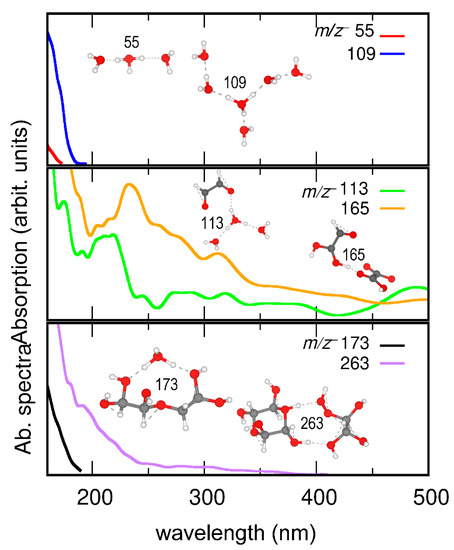 Calculated absorption spectra of representative cluster ions of m/z+ 55 (H2O)3H+, m/z 109 (H2O)6H+, m/z 113 C2H2O2···(H2O)3H+, m/z 165 C2H3O3···C2H2O4H+, m/z 173 C4H10O6···H3O+, and m/z 263 C4H8O6···C2H6O5H+. Insets show snapshots of AIMD trajectories.