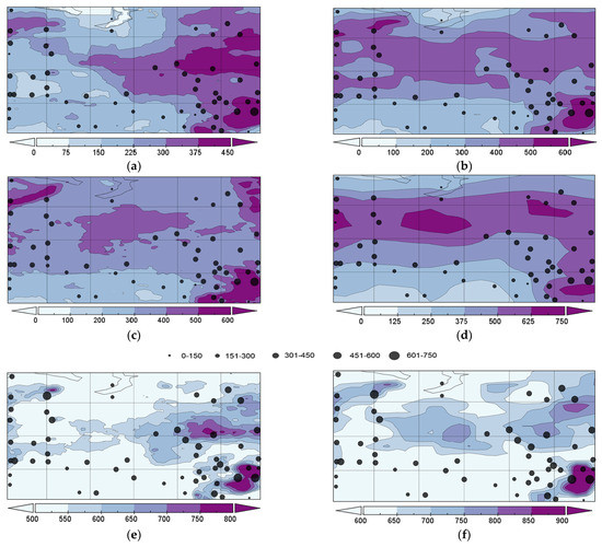 The most significant linear trend coefficients are observed in the regions of Siberia in the spring. Moreover, in Northern Eurasia, there is a moderate increase in the total amount of precipitation accompanied by a relatively strong increase in heavy rainfall and a simultaneous decrease in stratiform precipitation for the period 1966–2016 [3]. According to the CMIP5 projections, in the 21st century, annual and seasonal precipitation will increase everywhere, especially in the arctic region of Russia [4]. The frequency of heavy precipitation is influenced by changes in the characteristics of air humidity and atmospheric circulation that can lead to the development of extreme climatic events. First of all, this increases the frequency of severe floods and droughts [5]. The trends in extreme precipitation are also correlated with the geographic features of the region and the used data source quality [6,7].