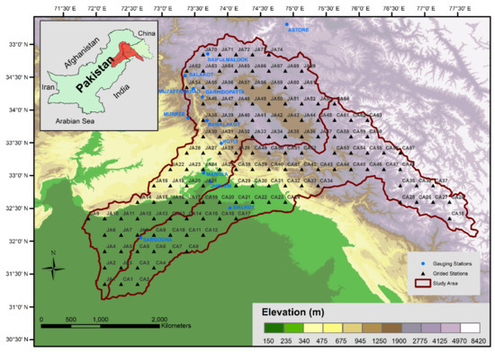 The area under study is approximately 100,845 km2, which comprises two basins of Pakistan’s rivers, namely the Jhelum and Chenab. The altitude from the mean sea level varies between 146 and 6915 m. Figure 1 presents the digital elevation model and geographic location of the study area. The precipitation gauging stations and the points on which gridded data have been sampled is also shown in Figure 1. The westerly aggravations and the southwest monsoon are the major cause of 60% and 40% of the annual precipitation, respectively [16]. The variable climatic conditions depend upon the atmospheric circulation patterns, advected moisture, and a considerable range of variations in topography. The depleting water resources and recurrence of extreme events due to high hydro-climatic variability in the region have made it an important research arena.
