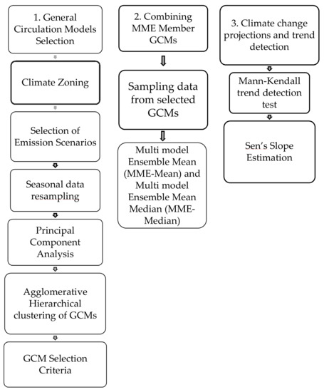 With the help of Machine learning algorithms, large datasets of multivariate atmospheric parameters can easily be assessed and analyzed for the pattern/distribution variability study and impact modeling. Each step of the framework developed in this study has been translated into Python code. This framework of the study consists of three major steps (1) GCMs selection; (2) Combining the GCMs; and (3) climate change projections and trend detection. Figure 2 presents the flow chart of the methodology adopted in this study. Further details of all steps are discussed in the subsequent sections.